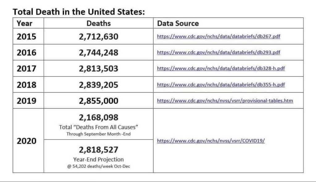 Except that there are people suffering with COVID-19 and that is not funny. We have what is essentially a bad flu year with a microscope on every bit of minutia related to this year’s special strain. Another wakeup call was learning that the total number of deaths each year for the last five years has NOT been exceeded this year! (see image below) If so many people are dying of covid, wouldn’t the death count be through the roof this year? But it is not. Strangely enough, there are very few flu cases and many people are diagnosed with covid over the phone, without a test, based on symptoms alone. My own daughter had a positive covid test 2 weeks after being exposed and having a few sniffles. 2 weeks later, after feeling fine and living her life, she got a positive test. What the heck? Many deaths are marked as death from covid 19 even if another condition precipitated. We are all over the map in assessing the magnitude of impact. The major group affected by this wild flu is the elderly. I am not being callous, but we need to remember as a collective that people get sick, people get the flu, people die. It is how it goes. We cannot live in such fear of death we will harm ourselves and our quality of lifelong term to attempt to defy this fact. We must focus on what we can do in the here and now to help ourselves b/c my friends, the help is not going to come from the powers that be in the western medical system.